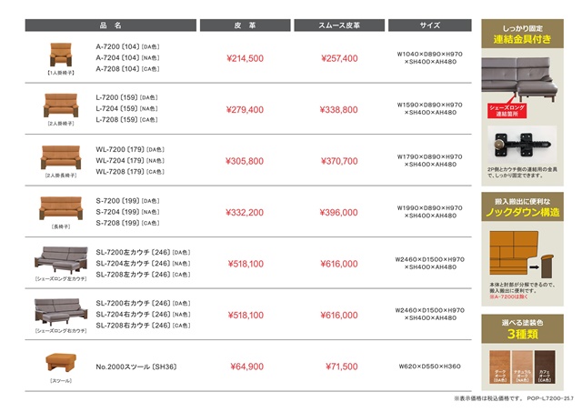 浜本工芸のスムース皮革張ソファ No.7200 です(一部合成皮革)。 カラーは、スムース皮革 7色、皮革 14色からお選びいただけます。 一体化シート加工技術を採用しています。張地と補強材を一体化させることで、シワになりにくく、ソフトでしなやかな肌触りを実現しました。 また、Sバネと高反発ウレタンの組み合わせは、硬めの座り心地と、高い耐久性を生み出しています。