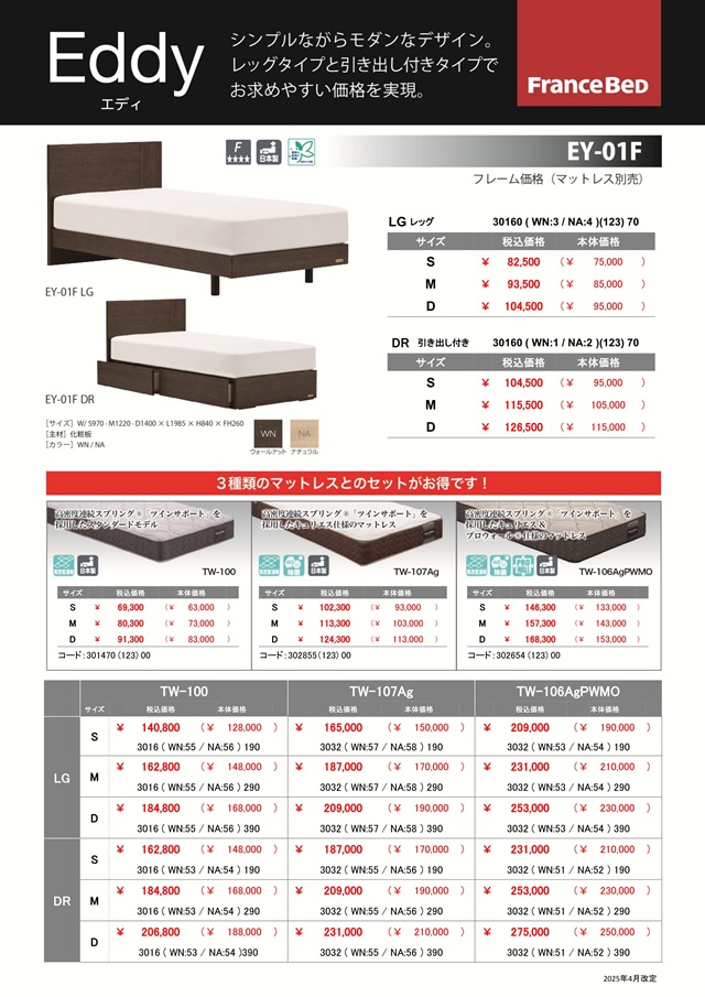 【エディ EY-01F 】サイズは、シングル・セミダブル・ダブルの3サイズ。レッグ(LG)タイプと引き出し付き(DR)タイプの2タイプ。色は、WN(ウォールナット/木目柄化粧板)・NA(ナチュラル/木目柄化粧板)の2色。 マットレスは、TW-100をセットいたしました。高密度連続スプリング・ダブルニット生地を採用しました。
